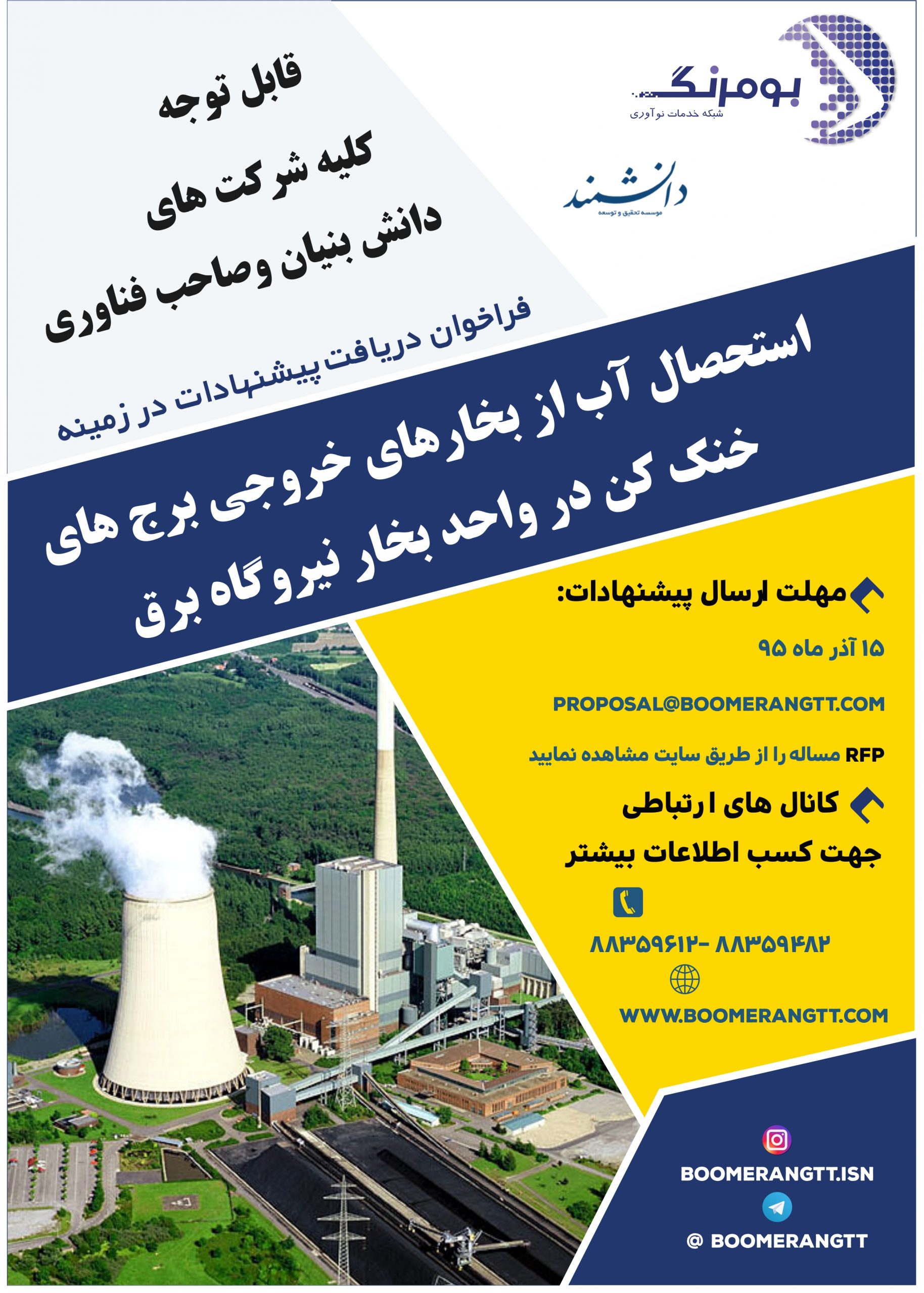 آب گردشی سیستم خنک‌کن واحد بخار، پس از جذب گرما وارد برج خنک‌کن از نوع تر می­‌شود تا حرارت جذب شده را به محیط منتقل کند. این انتقال گرما از طریق تبادل حرارتی با هوا صورت می­‌گیرد. با توجه به نوع برج خنک‌کن که تماس مستقیم آب‌وهوا ضروری است، لزوماً مقداری از جریان آب ریزشی در برج، در اثر تبادل حرارتی بخار شده و از خروجی برج خنک‌کن وارد محیط می­‌شود. با توجه به دبی بالای آب در گردش، مقدار قابل‌ملاحظه‌ای از بخار آب سالیانه وارد محیط می­‌شود که در صورت استحصال آب از این بخار خروجی، نه تنها موجب صرفه‌جویی ارزشمندی در این زمینه خواهد شد بلکه در وضعیت بحران کنونی منابع آبی، پروژه ارزشمندی به لحاظ اقتصاد مقاومتی می­‌باشد. طبق اعلام مرکز مطالعات استراتژیک، با توجه به میزان منابع آب و سرانه‌­­ی مصرف، ایران ازجمله کشورهایی است که در گروه کشورهای مواجه با کمبود فیزیکی آب قرار دارد. این گروه شامل کشورهایی است که در سال ۲۰۲۵ با کمبود قطعی فیزیکی آب مواجه هستند. این بدان معناست که حتی با باﻻترین راندمان و بهره‌وری ممکن در مصرف آب، برای تأمین نیازهایشان آب کافی در اختیار نخواهند داشت. اقلیم عمدتاً گرم و خشک ایران به همراه مدیریت ناصحیح منابع آبی و عطش توسعه در صنعت و کشاورزی از عوامل اصلی بحران آب در کشورمان است. پرواضح است که برداشتن هر گامی در جهت کاهش مصرف و یا استحصال آب، بسیار ارزشمند می‌­باشد. با بازیابی و استحصال آب از بخارهای خروجی برج خنک‌کنِ تر در واحد­های نیروگاهی و یا پیشنهاد طرحی برای کاهش نرخ تبخیر آب ریزشی، علاوه بر صرفه‌جویی در مصرف کلی آب نیروگاه و مزایای زیست‌­محیطی، کاهش هزینه­‌ها را نیز می‌توان به همراه داشت، لذا این شرکت بزرگ نیروگاهی در نظر دارد در زمینه استحصال آب از بخارهای خروجی برج‌های خنک‌کن در واحد بخار نیروگاه برق با دارندگان این فناوری تعامل و همکاری نماید.