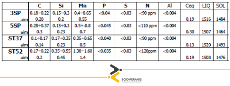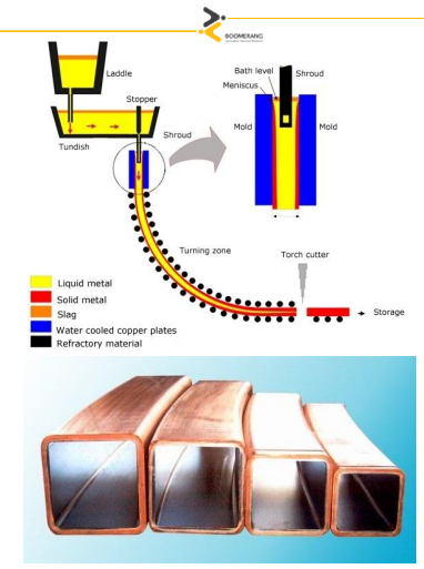ظرفیت تولید خطوط ریختهگری این شرکت حدود ۲/۱ میلیون تن در سال است. ریختهگری موجود مشتمل بر ۶ خط بوده است و مقطع بیلتهای تولیدی از ۱۰۰ تا ۲۰۰ میلیمتر خواهد بود. دمای ذوب از ۱۵۰۷ تا ۱۵۲۰ درجه سانتیگراد وابسته به نوع فولاد تولیدی، متفاوت خواهد بود. دمای انجماد نیز به تبع آن از ۱۴۹۳ تا ۱۴۶۳ درجه سانتیگراد متفاوت است. لذا دمای کاری تیوپ مسی بین این دو عدد متغیر میباشد. تیوپ مربوطه از یک سو در تماس مستقیم با مذاب بوده و از بیرون در تماس با آب قرار دارد. ضخامت لایه (فیلم) تشکیل شده در تماس با تیوپ ۳- ۴ میلیمتر میباشد. در ادامه ابعاد مختلف مورد نیاز تیوب مسی ارائه میگردد. نقشه مورد نظر برای تولید تیوب مسی هم در فایل ضمیمه آورده شده است. با توجه به نوع فولاد تولیدی ( .., ۳SP,۵SP) عدد کربن معادل و به تبع آن درجه انجماد متفاوت خواهد بود. لذا ابعاد پوسته (فیلم) تشکیل شده در مجاورت تیوب مسی به تناسب نوع فولاد تولیدی متفاوت میباشد. در جدول ذیل اعداد کربن معادل و دمای ذوب و انجماد آورده شده است تا در صورت نیاز در محاسبات لحاظ گردد.