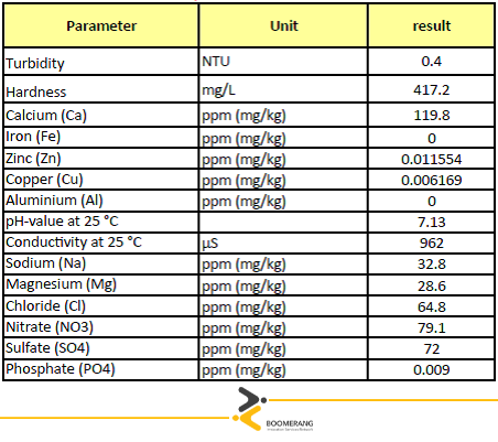 در این واحد صنعتی آب مصرفی بویلرها و سیستمهای هیتینگ و کولینگ توسط سیستم رزینهای تعویض یونی سختیگیری میشود. در سالن تولید نیز آب قبل از مصرف توسط دستگاههای RO سختی گیری میشود و سپس مورد استفاده قرار میگیرد. جدول زیر آنالیز آب مصرفی این واحد صنعتی را نشان میدهد: